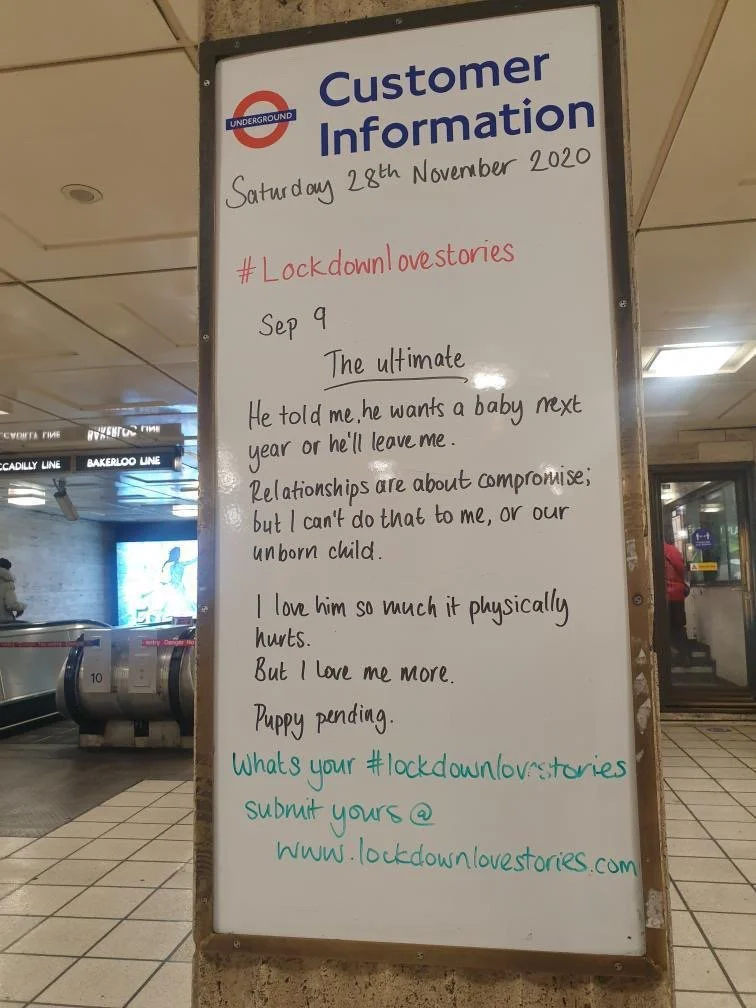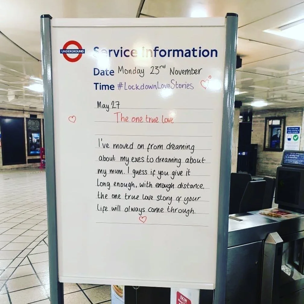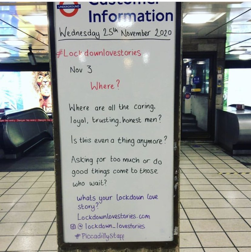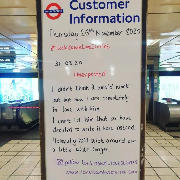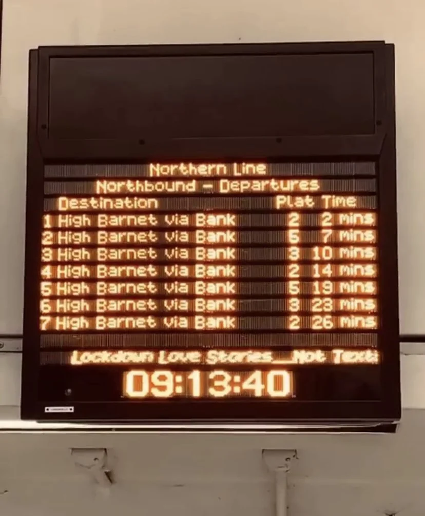 The London Underground: usually the heart of London, but a space of anxiety during the pandemic. Lockdown Love Stories appear on the DMI tube annoucement board on the Station Platform and the Quote of the Day Board in the Ticket Hall at Morden Station and Piccadilly Circus, on Valentine’s Day and during National Lockdown 2 in the UK.